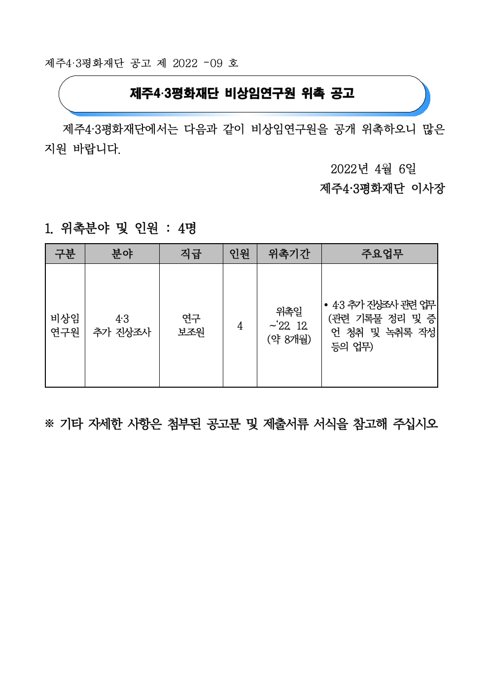 [채용(위촉)]제주4・3평화재단 비상임연구원(4・3추가진상조사)