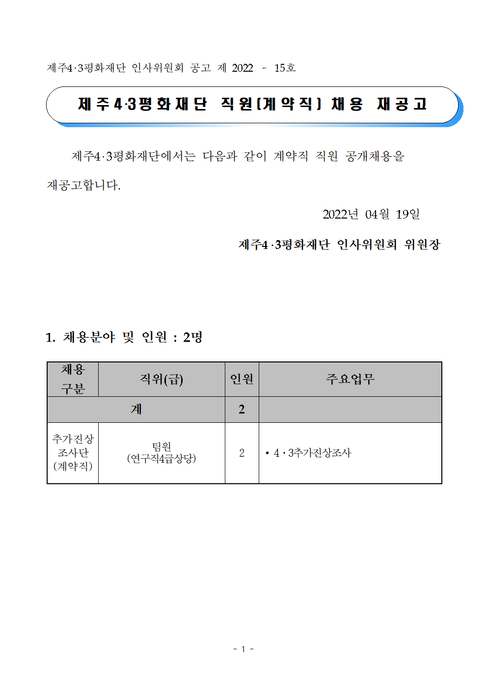 [채용] 제주4·3평화재단 직원(계약직) 채용 재공고