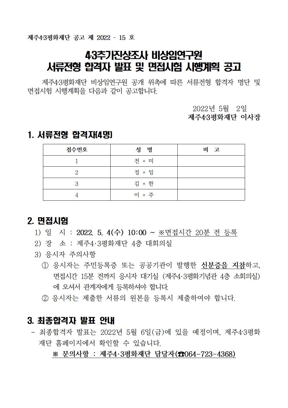 [채용(위촉)]제주4・3평화재단 비상임연구원(4・3추가진상조사) 위촉 서류전형 합격자 발표 및 면접시험 시행계획 공고