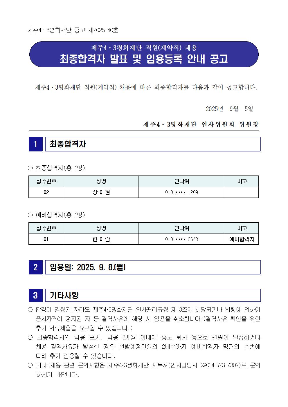 [채용]제주4.3평화재단 직원(계약직) 채용 최종합격자 발표 및 임용등록 안내