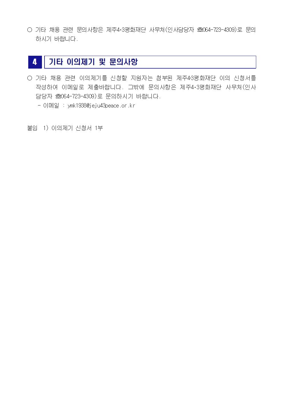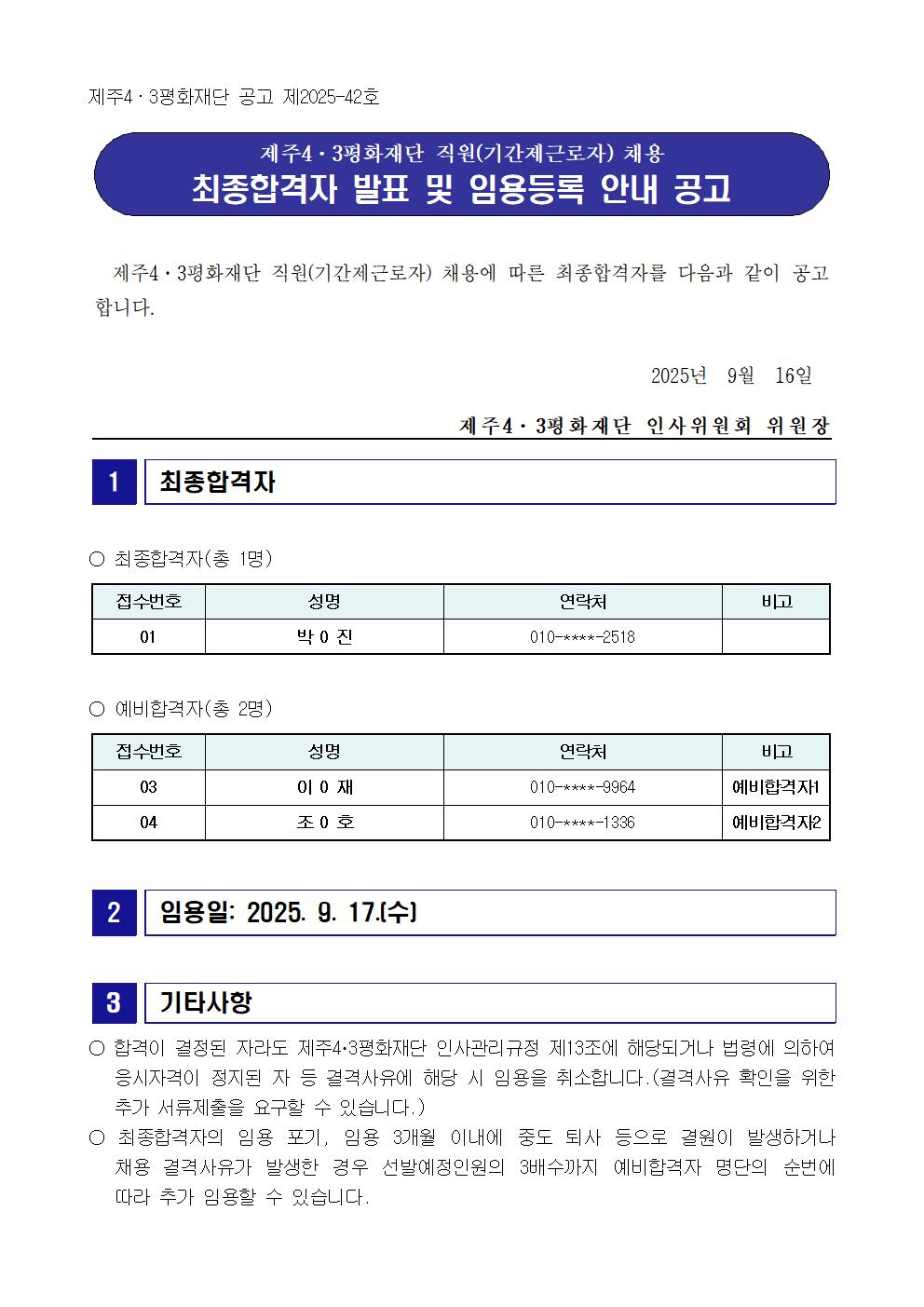 [채용]제주4.3평화재단 직원(기간제근로자) 채용 최종합격자 발표 및 임용등록 안내