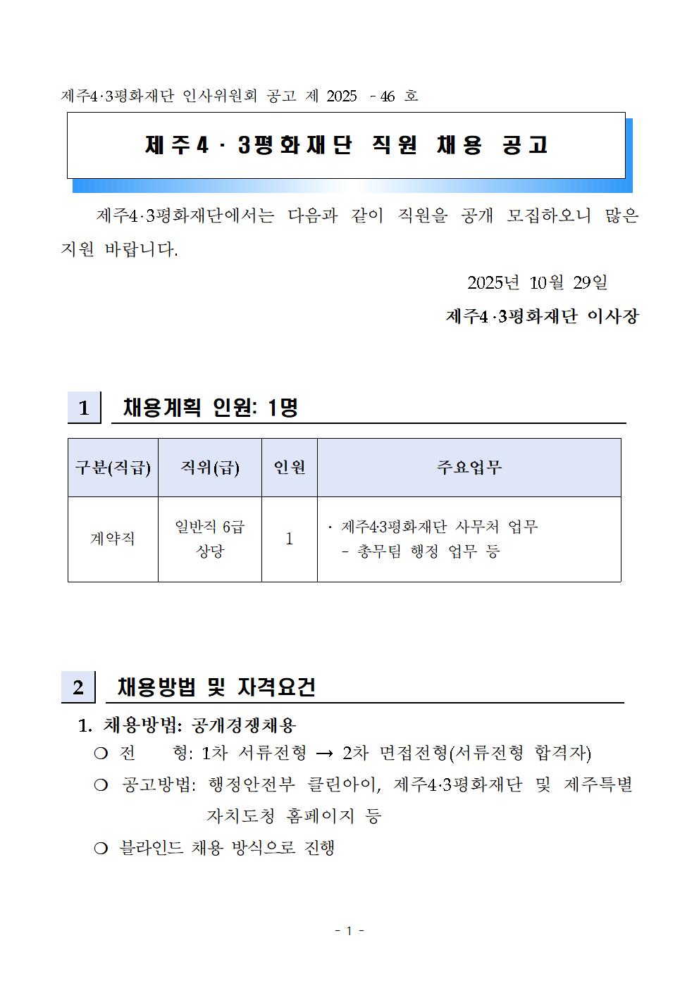 [채용]제주4.3평화재단 직원(계약직) 채용 공고