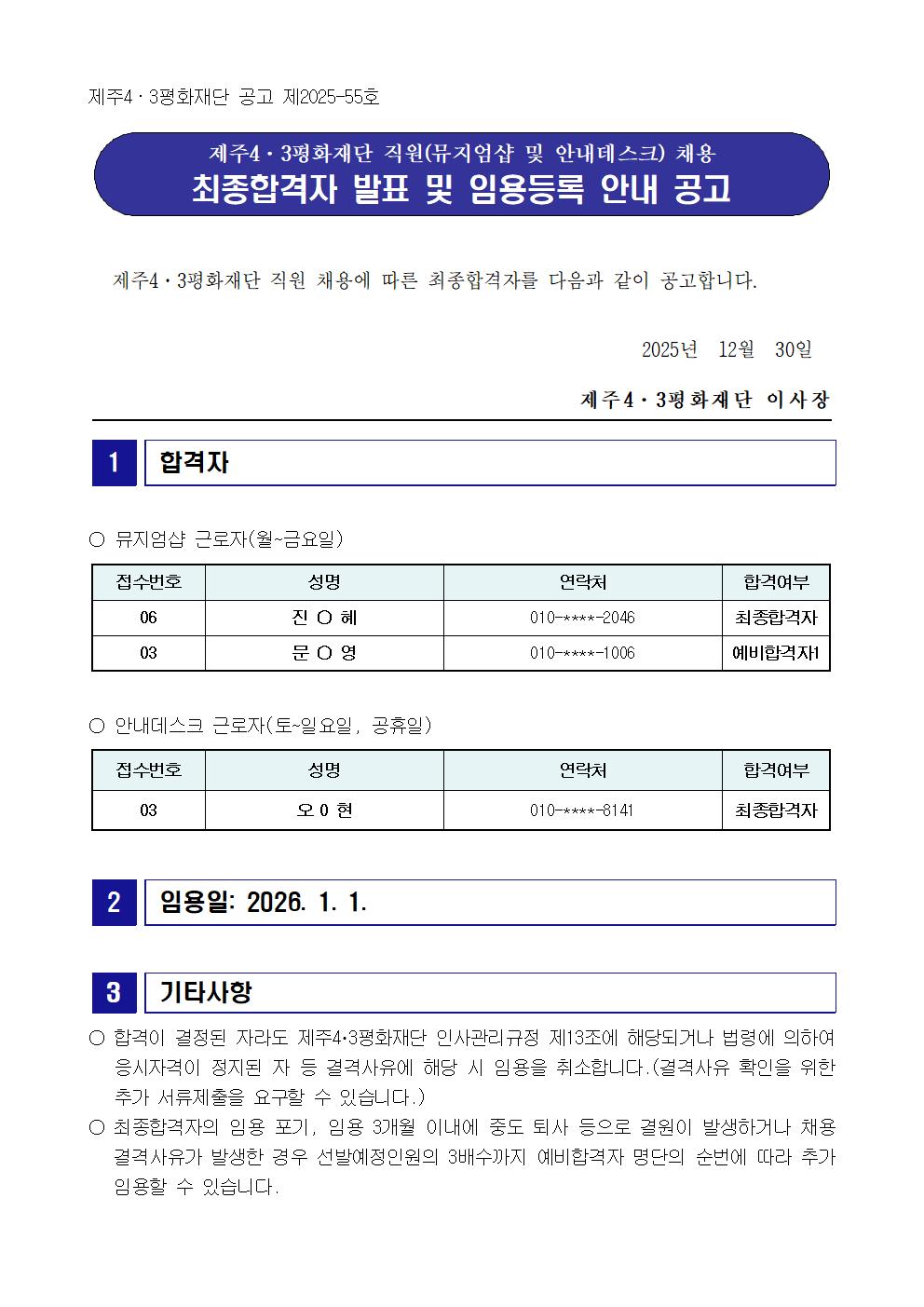 [채용]제주4.3평화재단 직원(뮤지엄샵 및 안내데스크) 채용 최종합격자 발표 및 임용등록 안내