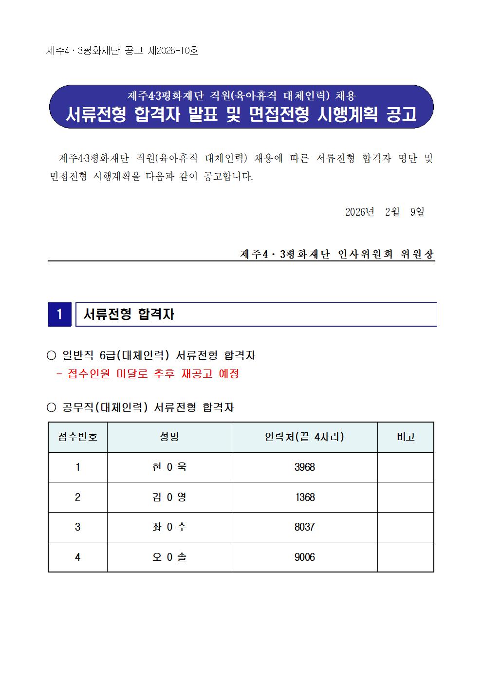 [채용]2026년 재단 직원(육아휴직 대체인력) 서류전형 합격자 발표 및 면접전형 시행계획 공고