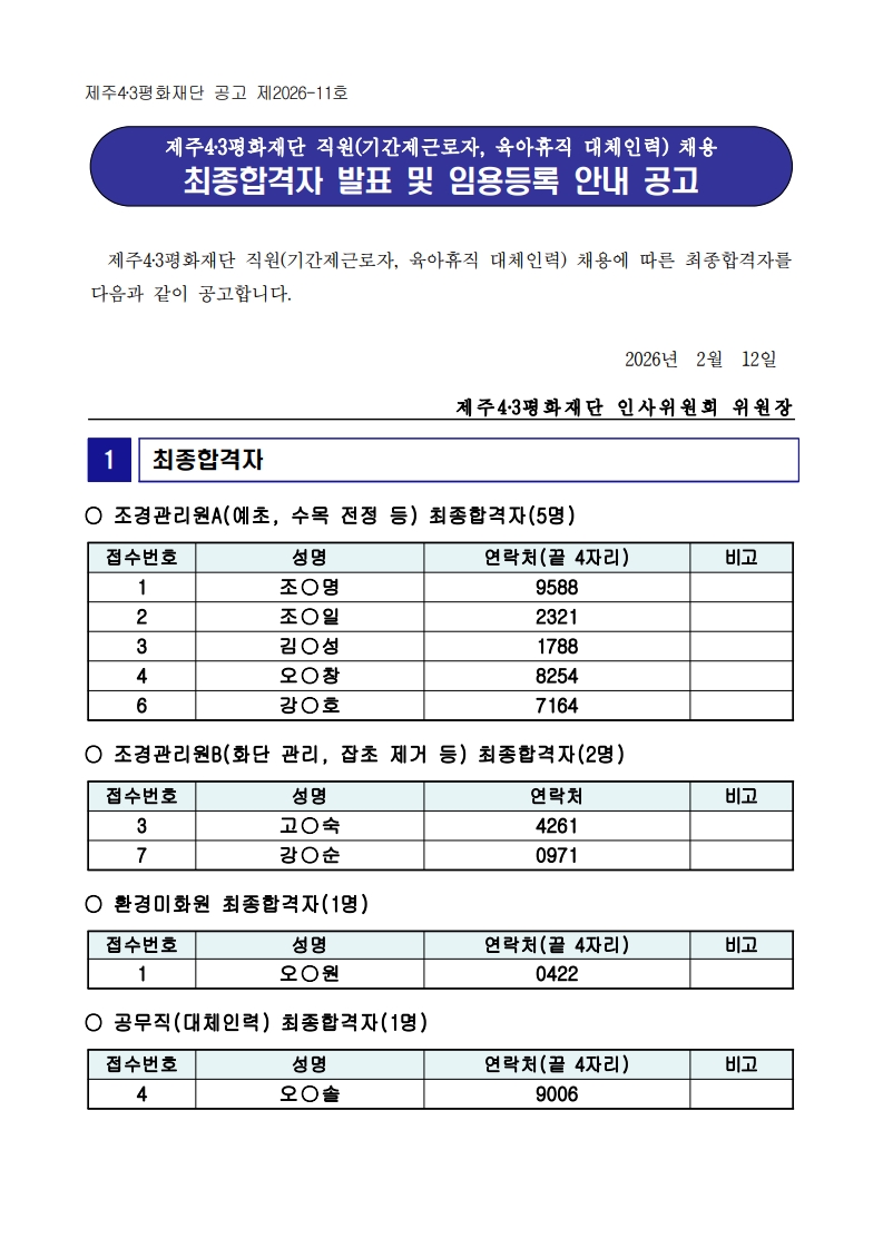 제주4‧3평화재단 직원(기간제근로자, 육아휴직 대체인력) 채용 최종합격자 발표