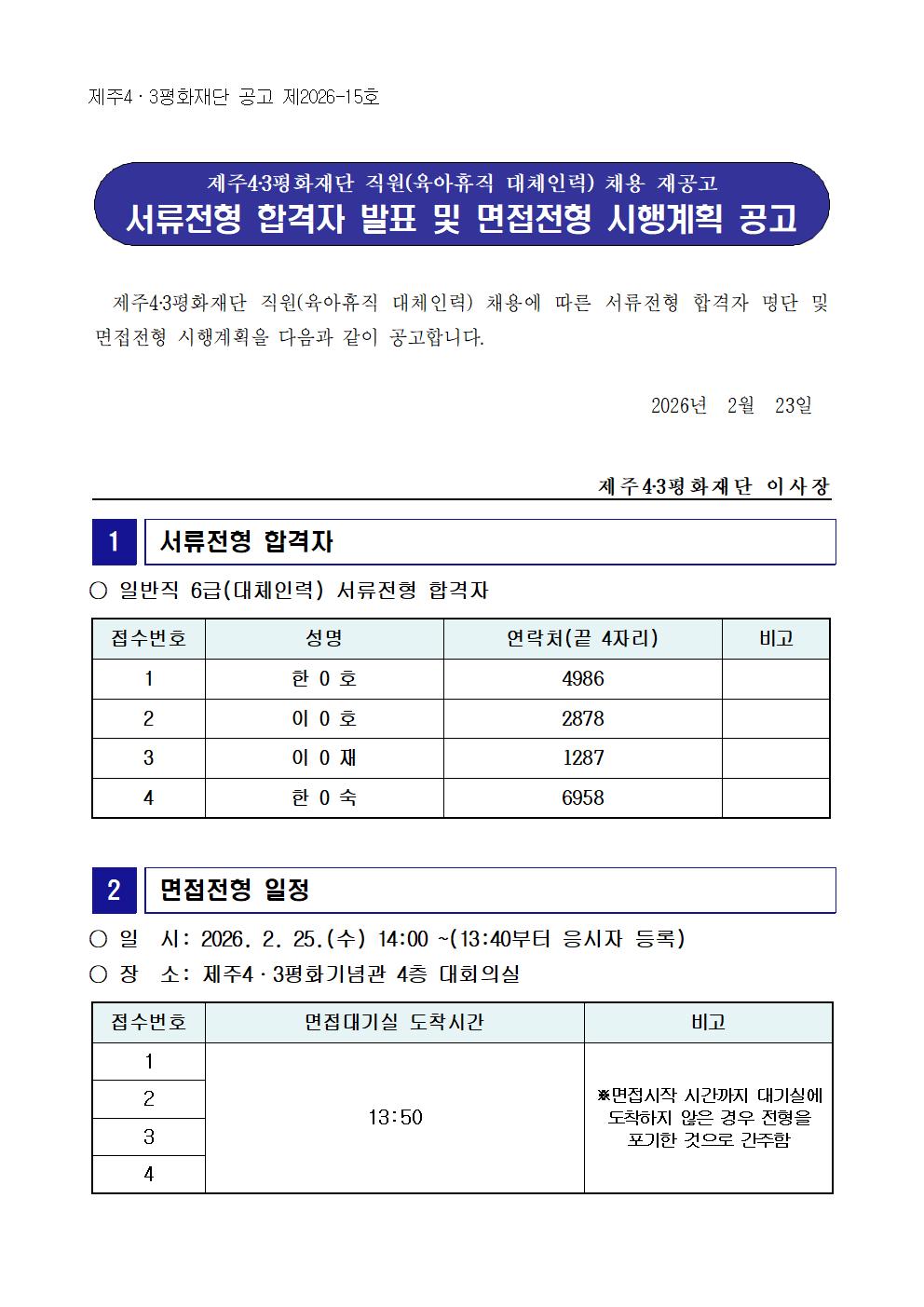 [채용]2026년 재단 직원 육아휴직 대체인력(일반직6급 재공고) 서류합격자 공고 및 면접전형 안내