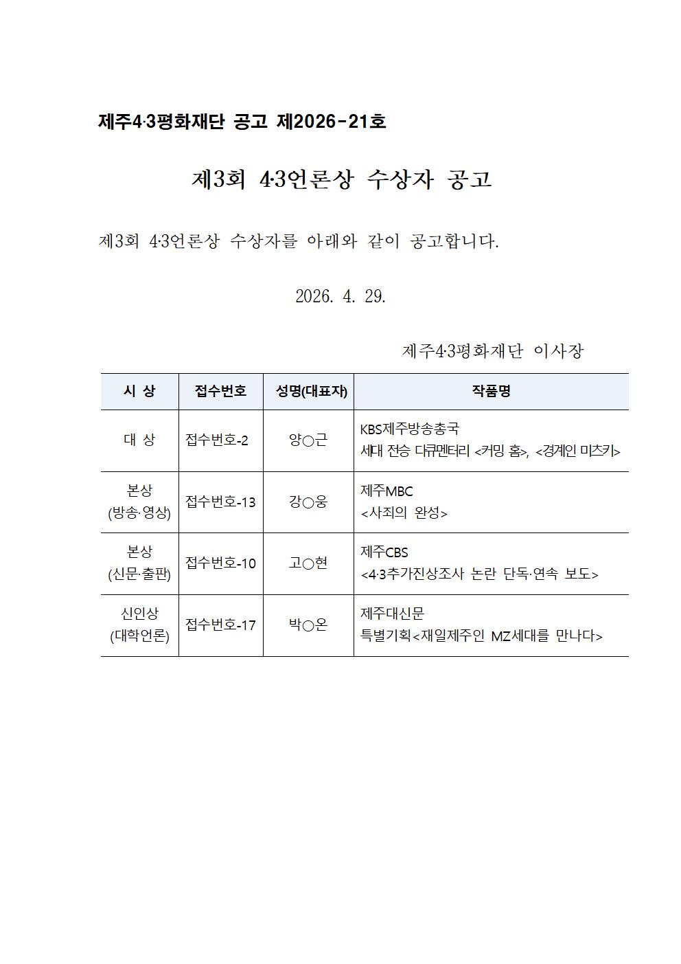 장려상 - 4․3과 평화, 그리고 현재(現在)