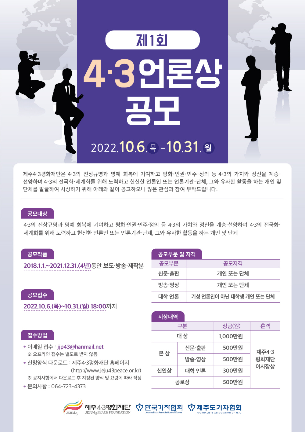 4‧3언론상 공모 접수는 오는 10월 31일 오후 6시까지 이메일(jjp43@hanmail.net)로 받는다. 자세한 내용은 제주4‧3평화재단 홈페이지(www.jeju43peace.or.kr)에서 확인할 수 있다.
