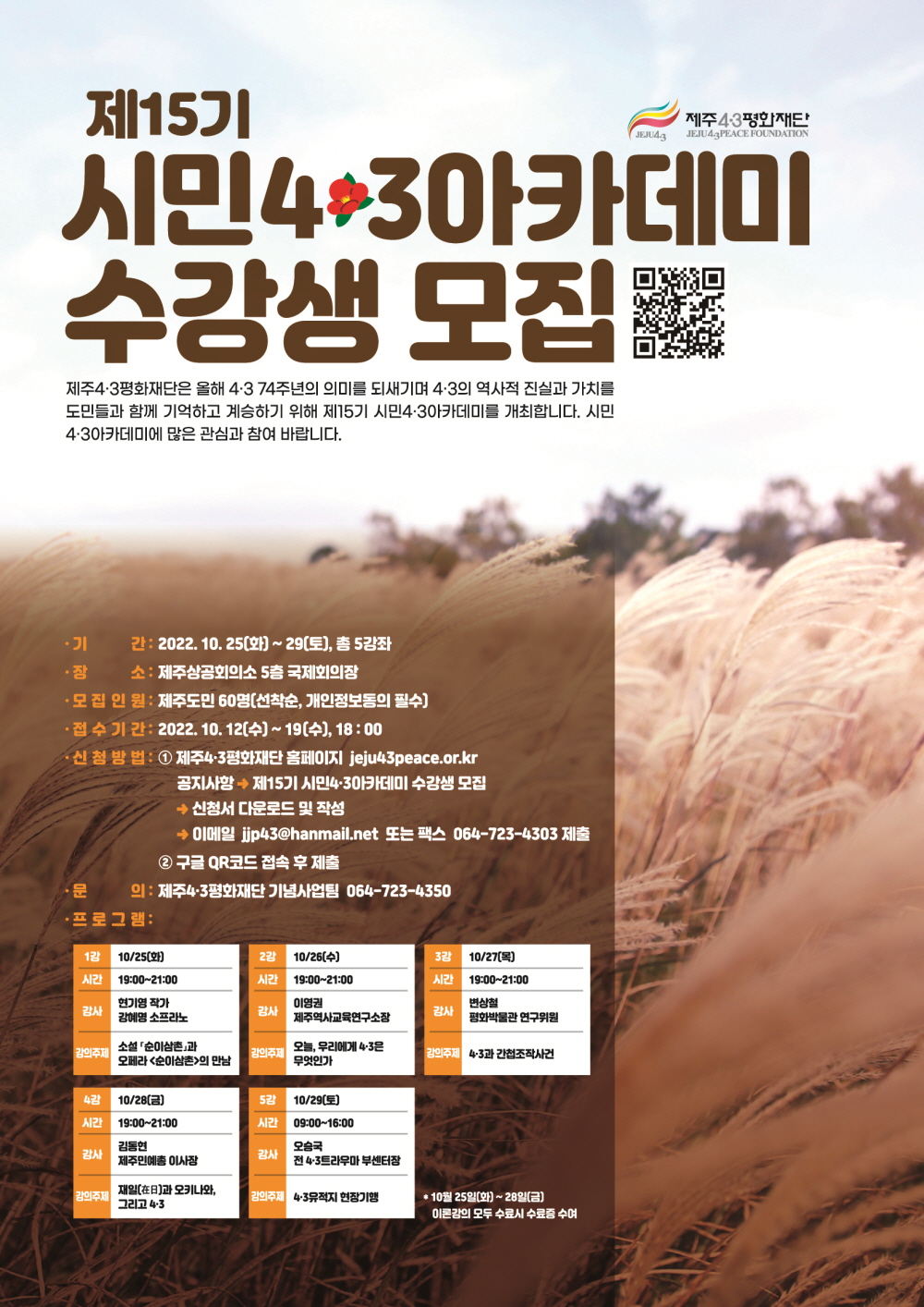제주4‧3평화재단(이사장 고희범)은 제15기 시민4‧3아카데미 강좌 수강생 60명을 선착순으로 모집하고 있으며, 모집기간은 10월 12~19일이다.