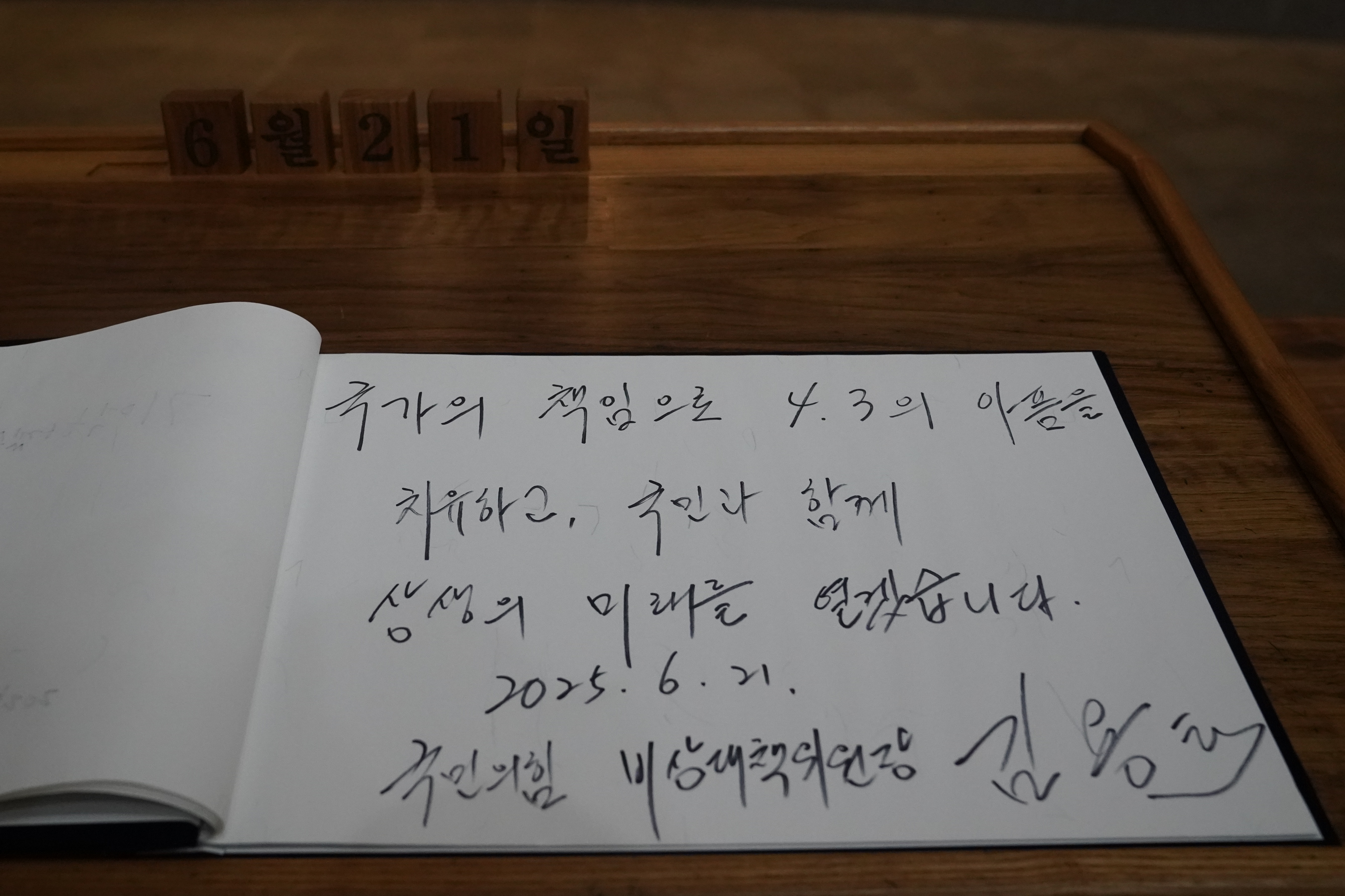 김용태 위원장은 방명록에 '국가의 책임으로 4·3의 아픔을 치유하고, 국민과 함께 상생의 미래를 열겠습니다'라고 남겼다.