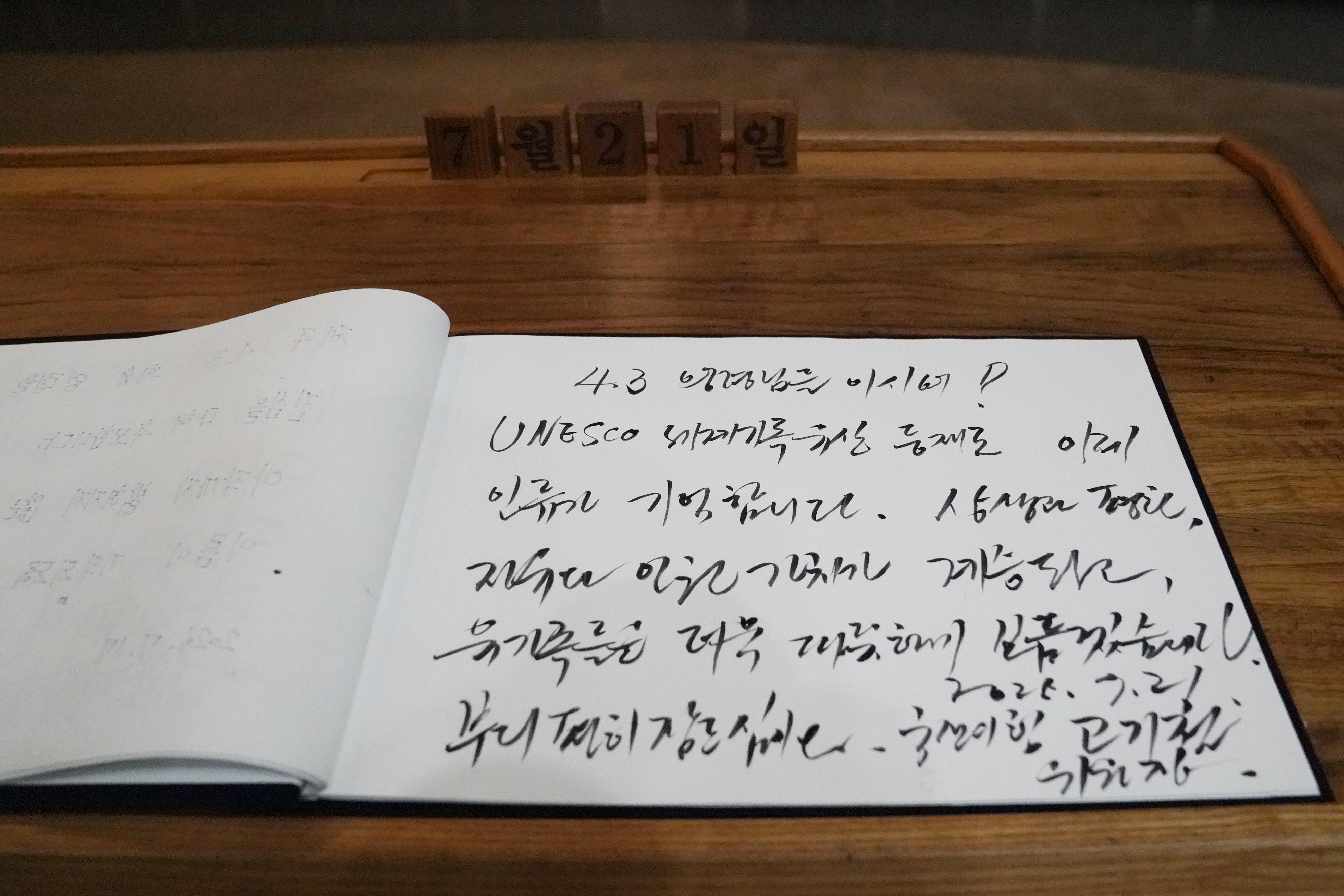 국민의힘 고기철 위원장은 방명록에 '4·3의령님들이 시어! UNESCO 세계기록유산 등재로 이제 인류가 기억합니다.