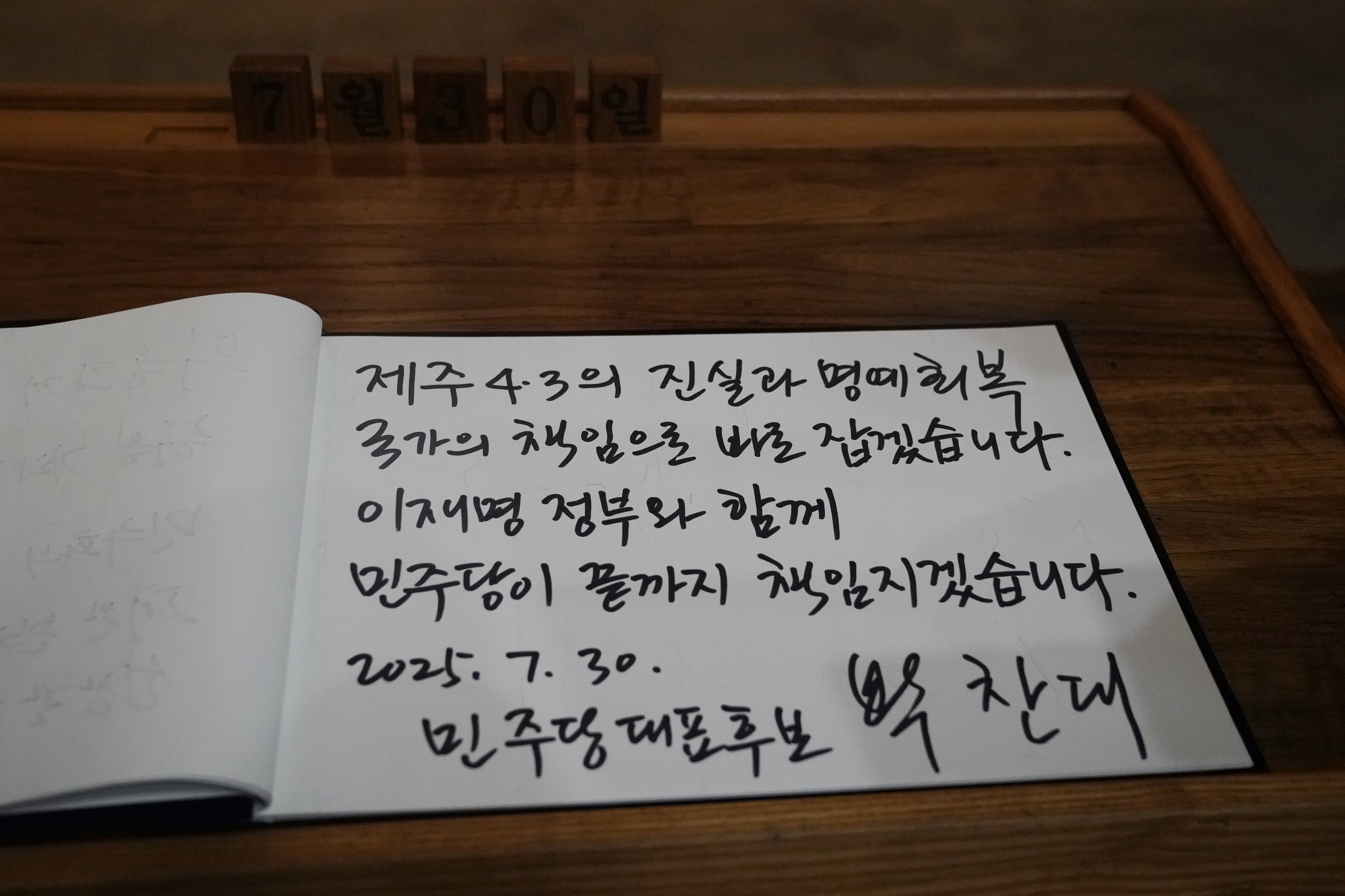 더불어민주당 박찬대 당대표 후보는 방명록에 '제주4·3의 진실과 명예회복 국가의 책임으로 바로 잡겠습니다. 이재명 정부와 함께 민주당이 끝까지 책임지겠습니다.'라고 남겼다.
