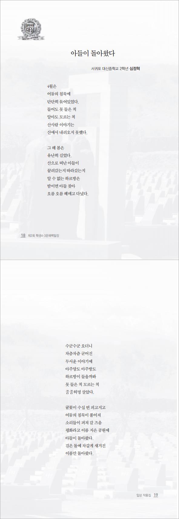 | 우수 | 4월의 그때, 시인의 곁에는 동백이 있었다 | 제주동여중 2학년 김민주 | ||