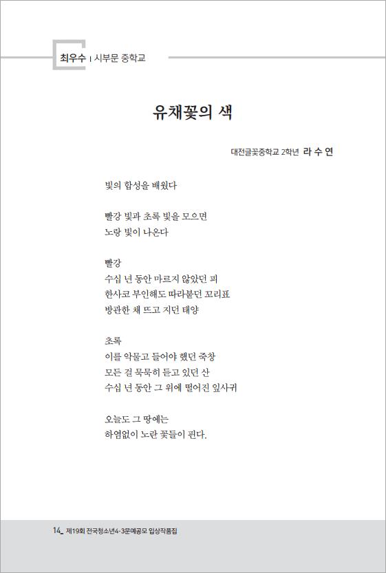 | 최우수 | 유채꽃의 색 | 대전글꽃중학교 2학년 라수연 |
