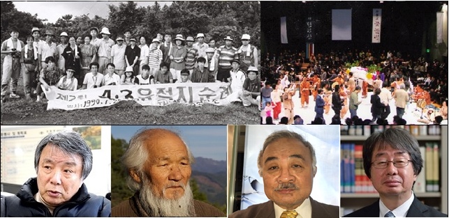 ▲ 위쪽 1990년 4·3연구소의 4‧3유적지 순례와 2003년 도쿄에서 놀이패 한라산의 마당극. 아래 왼쪽부터 양동윤, 김명식, 고이삼, 문경수 수상자