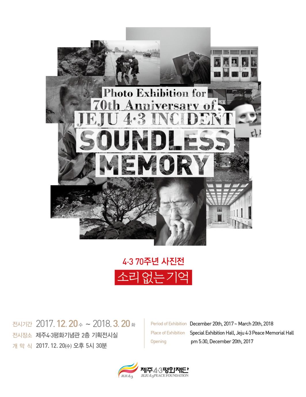 “소리 없는 기억”을 주제로 2017년 12월 20일(수)부터 2018년 3월 20일(화)까지 제주4․3평화기념관 2층 기획전시실에서 열리는 4․3사진展에는 전국의 다큐멘터리 사진작가 12명이 한국사회의 침묵에 대해 표현한 89점의 사진작품을 선보인다.