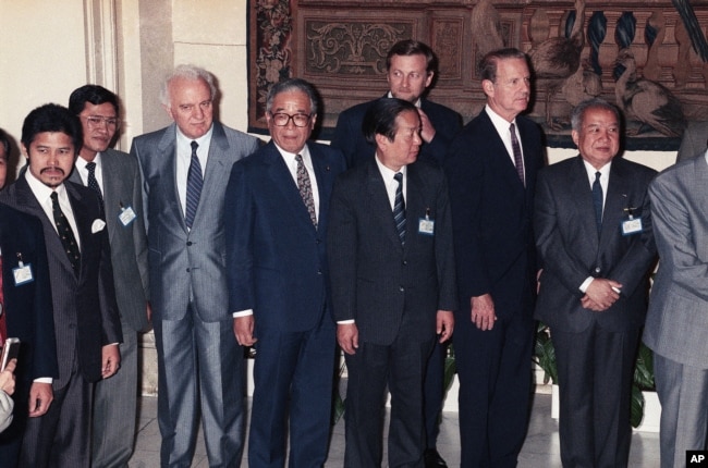 훈센 캄보디아 총리(왼쪽), 에두아르드 셰바르드나제 외무장관(소련), 미쓰즈카 히로시(일본), 첸치첸(중국), 개렛 에반스(호주), 제임스 베이커(미국), 캄보디아 저항 지도자 노로돔 시아누크 왕자와 함께-1989년 파리에서 열린 캄보디아 회의(AP 사진)