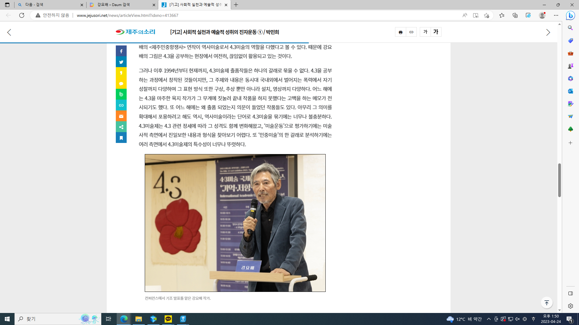 2003년 국제 학술 컨퍼런스 <기억·저항·평화> 에서 기조발표를 맡은 강요배 출처 : 제주의소리(http://www.jejusori.net) |
