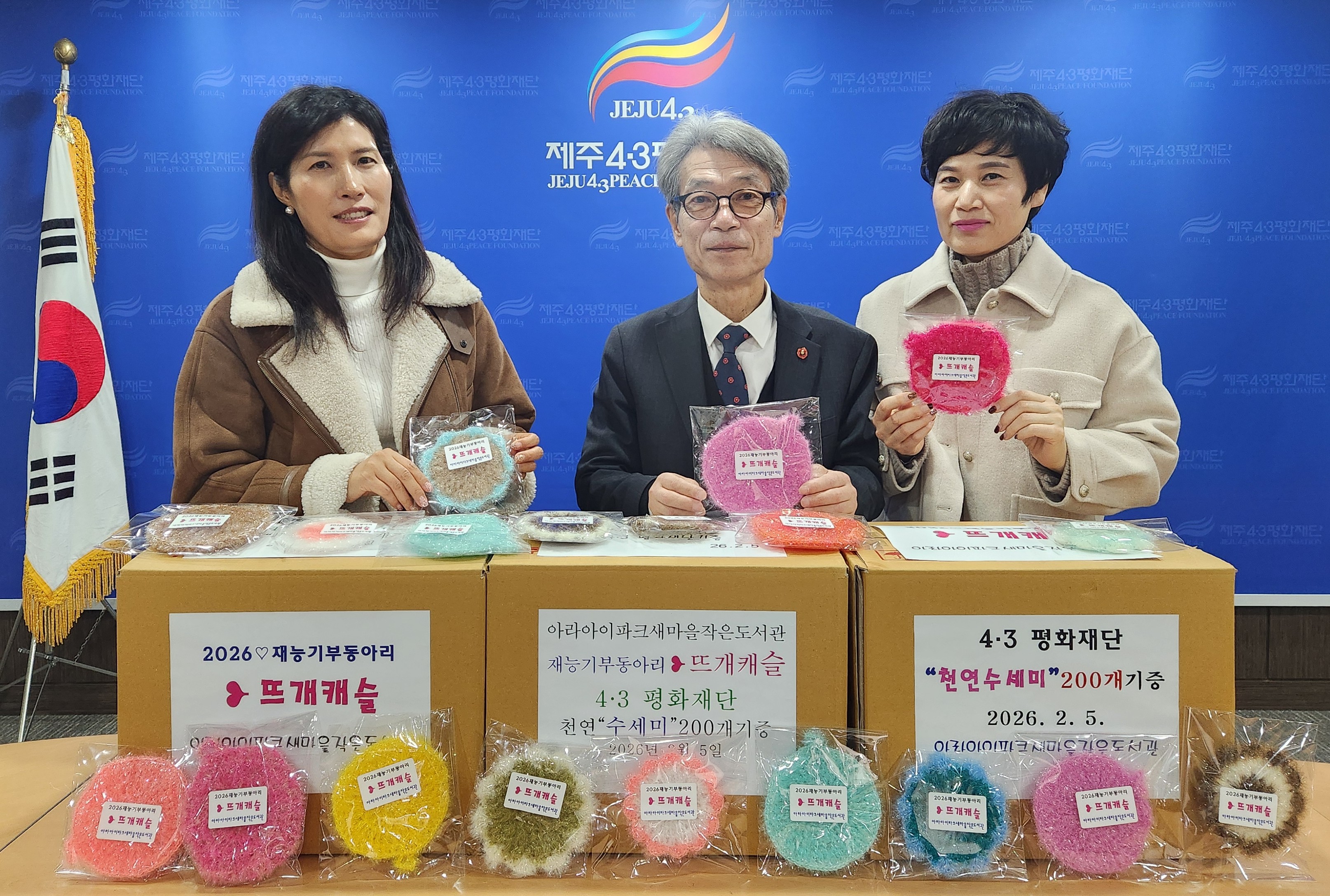 같은 날 아라아이파크 동아리 ‘뜨개캐슬’(회장 배주원)의 기탁식이 이어 열렸다. 친환경 천연재료를 이용해 동백꽃을 형상화하여 제작한 수세미 200개를 재단에 기탁했다. 수세미 뿐만 아니라 찻잔받침으로도 이용 가능한 기탁품은 4‧3의 아픔을 기억하고 평화와 인권의 가치를 일상 속에서 실천하고자 하는 동아리 회원들의 자발적인 재능기부로 마련됐다.